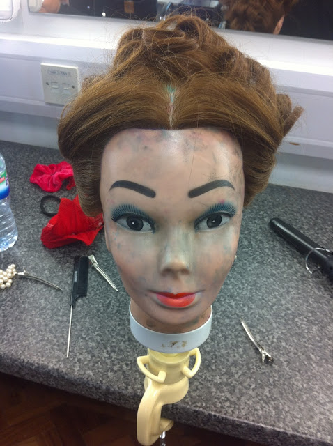 After I've sectioned everything I used a medium sized curling tongs and started curling and pinning the hair. Each section was backcombed at the roots before it was pinned. First I curled and pinned the ponytails (three sections in each) then added the hair that was on the sides, front and back. It is all about positioning and placing the curls, slowly building the haristyle. Curvy grips are best to use for pinning.